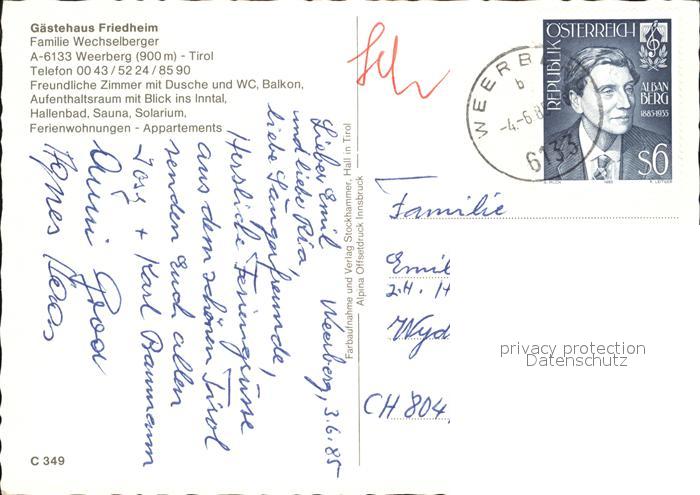 72579932 alte Postkarte Weerberg Gaestehaus Friedhelm postalisch gelaufen Erhaltung siehe scans [LiesaD40] KatCode: 11390335070938