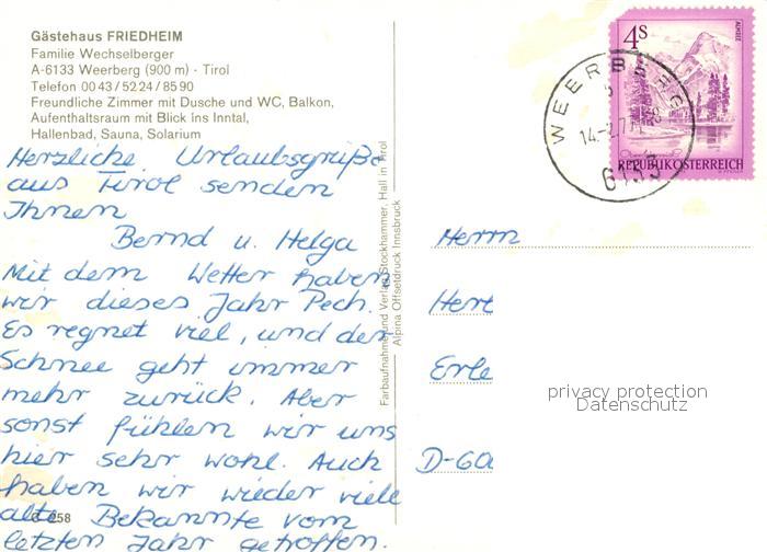 73588081 alte Postkarte Weerberg G?stehaus Friedheim postalisch gelaufen Erhaltung siehe scans [PaolaD17] KatCode: 11390335070938