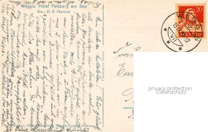 13792508 alte Postkarte Weggis Vierwaldstaettersee Hotel Felsberg Aussenansicht postalisch gelaufen Erhaltung siehe scans [LiesaD40] KatCode: 11470120385898