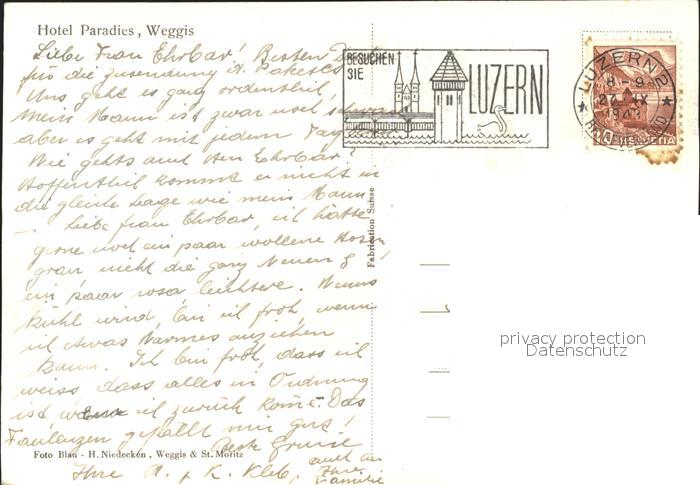 11648386 alte Postkarte Weggis Vierwaldstaettersee Hotel Paradies postalisch gelaufen Erhaltung siehe scans KatCode: 11470120385898