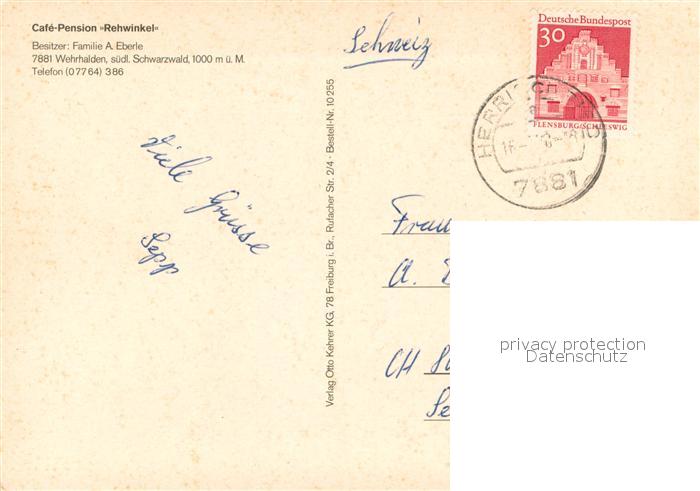 73658665 alte Postkarte Wehrhalden Cafe Pension Rehwinkel Gaststaette Landschaftspanorama Schwarzwald postalisch gelaufen Erhaltung siehe scans [FriedD77] KatCode: 11110008337049