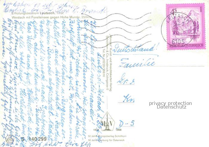 74156288 alte Postkarte Weidach Leutasch Innsbruck Tirol AT Weidach Forellensee Hohe-Munde Bergtal Wald Wiesen Alpenlandschaft Ortspanorama postalisch gelaufen Erhaltung siehe scans [Karloger] KatCode: 11390332070326