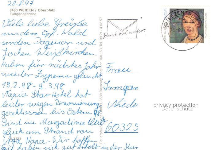 73214783 alte Postkarte Weiden Oberpfalz Innenstadt Fussgaengerzone Brunnen Strassencafes postalisch gelaufen Erhaltung siehe scans [FriedD77] KatCode: 11110009363000