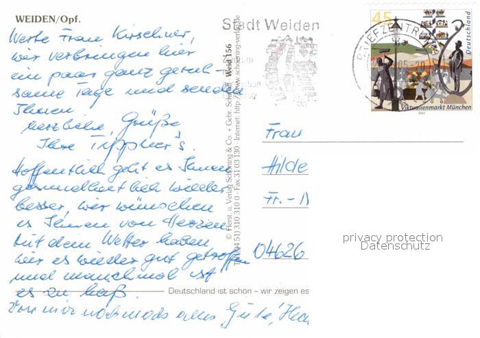 72859247 alte Postkarte Weiden Oberpfalz Marktplatz Brunnen Strassenpartie Kirche Runder Turm postalisch gelaufen Erhaltung siehe scans [WerneD78] KatCode: 11110009363000