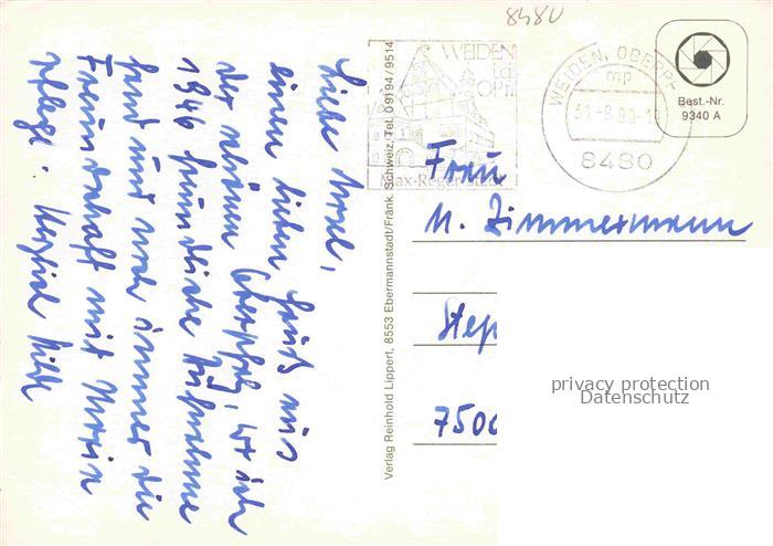74049357 alte Postkarte Weiden Oberpfalz Motive Stadtzentrum Stadtplatz Brunnen Denkmal postalisch gelaufen Erhaltung siehe scans [FriedD77] KatCode: 11110009363000