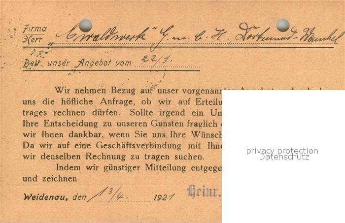 73700020 alte Postkarte Weidenau Sieg Heinrich Schumann Blechwaren Fabrik Geschaeftskorrespondenz postalisch gelaufen Erhaltung siehe scans [FriedD77] KatCode: 11110005970040