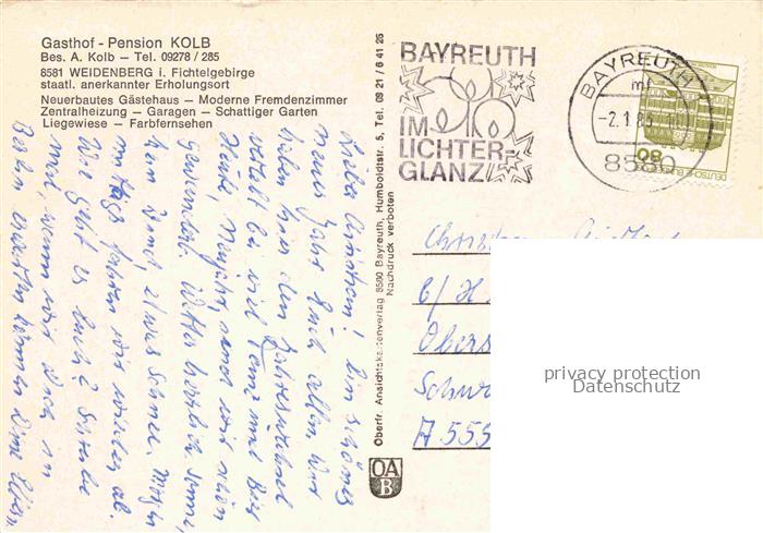 74029417 alte Postkarte Weidenberg Bayreuth Bayern Gasthof Pension Kolb Gastraum Ortsansicht mit Kirche postalisch gelaufen Erhaltung siehe scans [FriedD77] KatCode: 11110009472199