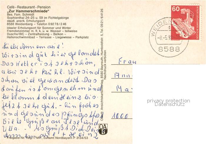 73645965 alte Postkarte Weidenberg Cafe Restaurant Pension Zur Hammerschmiede Hallenbad Fichtelgebirge Fliegeraufnahme postalisch gelaufen Erhaltung siehe scans [FriedD77] KatCode: 11110009472199
