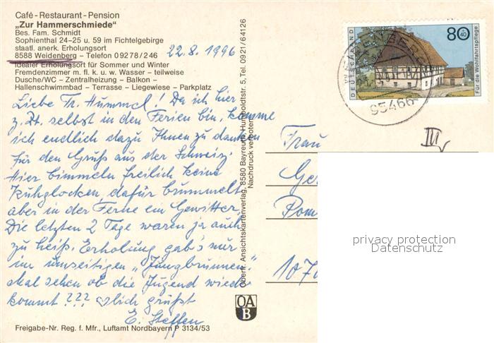 73641578 alte Postkarte Weidenberg Cafe Restaurant Pension Zur Hammerschmiede Hallenbad Fliegeraufnahme postalisch gelaufen Erhaltung siehe scans [FriedD77] KatCode: 11110009472199