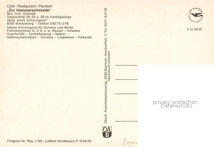 73662521 Weidenberg Cafe Restaurant Pension Zur Hammerschmiede Hallenbad Fliegeraufnahme postalisch nicht gelaufen Erhaltung siehe scans [FriedD77] KatCode: 11110009472199