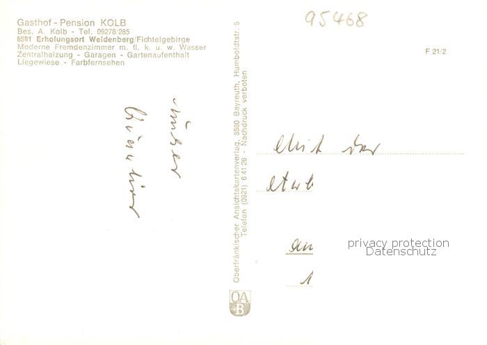 73867361 Weidenberg Gasthof Pension Kolb Gaststaette Hallenbad Ortsansicht mit Kirche postalisch nicht gelaufen Erhaltung siehe scans [FriedD77] KatCode: 11110009472199