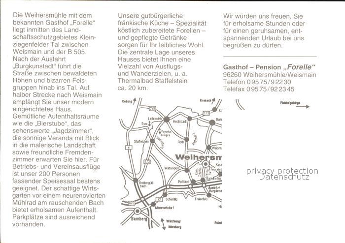 Weihersmuehle Bamberg Gasthaus Pension Forelle postalisch nicht gelaufen Werbekarte (keine Postkarte) Erhaltung siehe scans