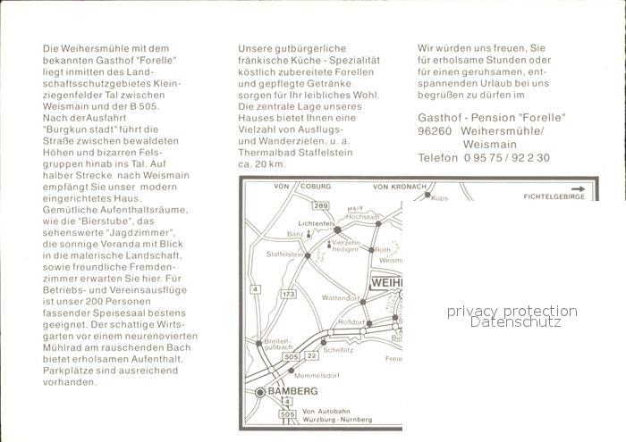 72263045 Weihersmuehle Weismain Gasthof Pension Forelle postalisch nicht gelaufen Werbekarte (keine Postkarte) Erhaltung siehe scans KatCode: 11110009478176