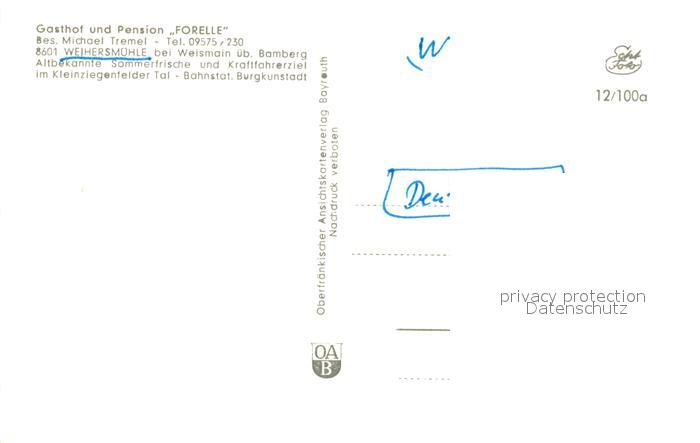 73645690 Weihersmuehle Weismain Gasthof Pension Forelle Landschaftspanorama Partie am Wasser postalisch nicht gelaufen Erhaltung siehe scans [FriedD77] KatCode: 11110009478176