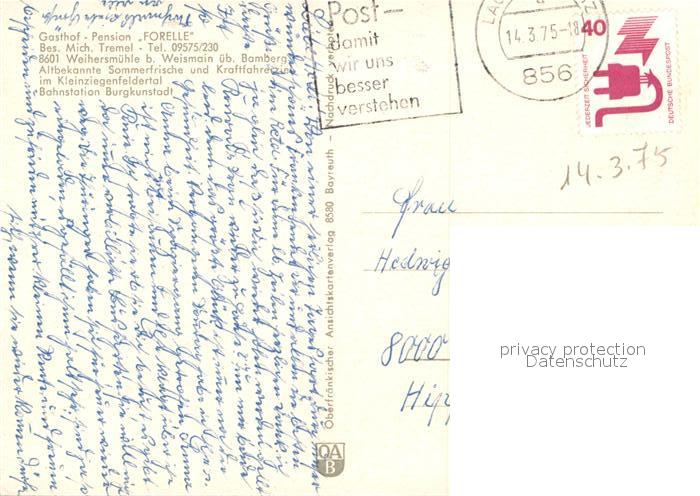 73143761 alte Postkarte Weihersmuehle Weismain Gasthof Pension Forelle Landschaftspanorama postalisch gelaufen Erhaltung siehe scans [FriedD77] KatCode: 11110009478176