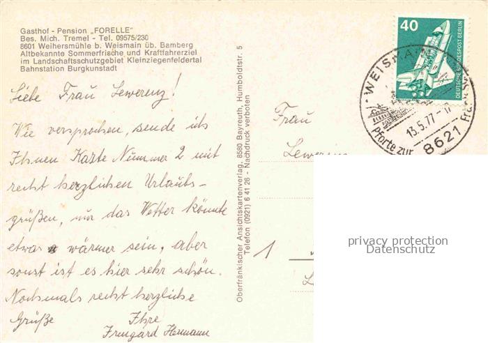 74027121 alte Postkarte Weihersmuehle Weismain Gasthof Pension Forelle Panorama Landschaftsschutzgebiet Kleinzigenfeldertal postalisch gelaufen Erhaltung siehe scans [FriedD77] KatCode: 11110009478176