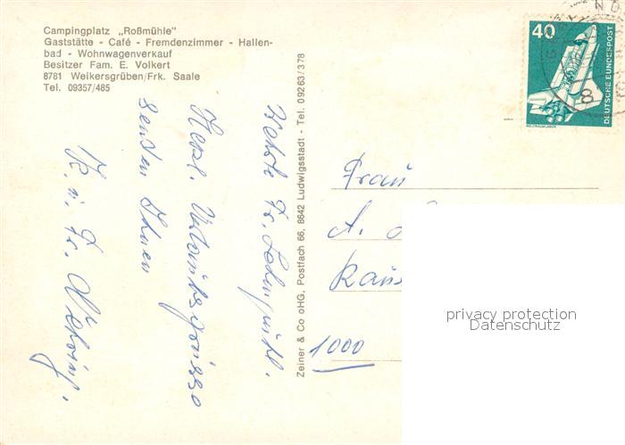 73654695 alte Postkarte Weikersgrueben Campingplatz Rossmuehle Gaststaette Landschaftspanorama Saale postalisch gelaufen Erhaltung siehe scans [FriedD77] KatCode: 11110009677133