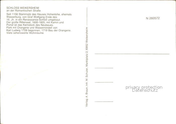 72232611 Weikersheim Schloss an der Romantischen Strasse Renaissance postalisch nicht gelaufen Erhaltung siehe scans KatCode: 11110008128126