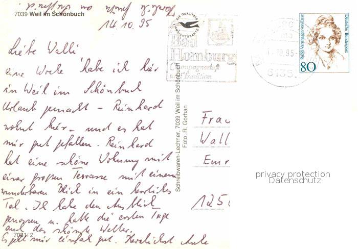 72682472 alte Postkarte Weil Schoenbuch Ortsansicht mit Kirche postalisch gelaufen Erhaltung siehe scans [FriedD77] KatCode: 11110008115051