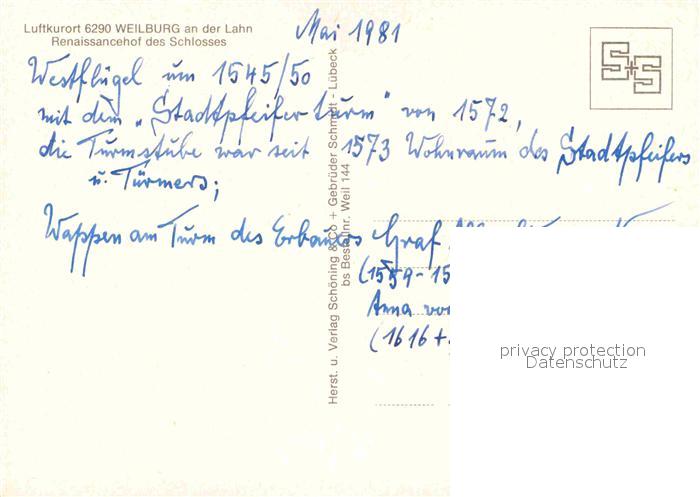 72719268 Weilburg Renaissancehof Schloss Luftkurort postalisch nicht gelaufen Erhaltung siehe scans [FriedD77] KatCode: 11110006533017
