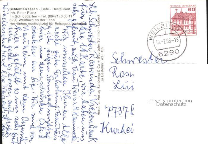 72478466 alte Postkarte Weilburg Schlossterrassen Cafe Restaurant Park Speisesaal Terrasse postalisch gelaufen Erhaltung siehe scans KatCode: 11110006533017