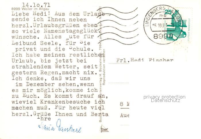 73258083 alte Postkarte Weiler Allgaeu Kirche Bach Panorama Rathaus postalisch gelaufen Erhaltung siehe scans [WerneD78] KatCode: 11110009776129