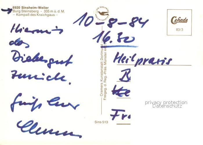 73269391 Weiler Sinsheim Burg Steinsberg Fliegeraufnahme postalisch nicht gelaufen Erhaltung siehe scans [WerneD78] KatCode: 11110008226085