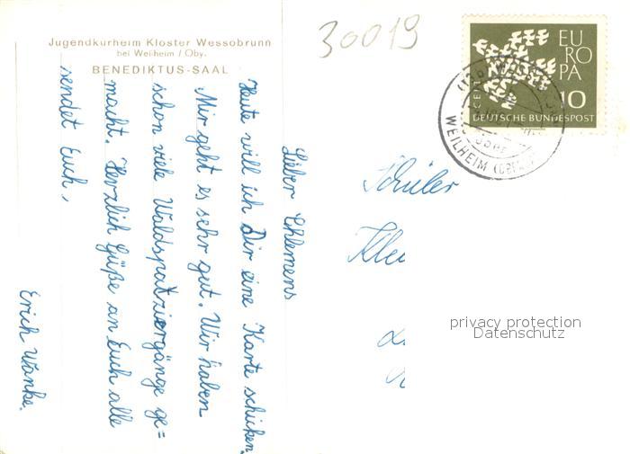 73734704 alte Postkarte Weilheim Oberbayern Jugendkurheim Kloster Wessobrunn Benediktus Saal postalisch gelaufen Erhaltung siehe scans [WerneD78] KatCode: 11110009190157