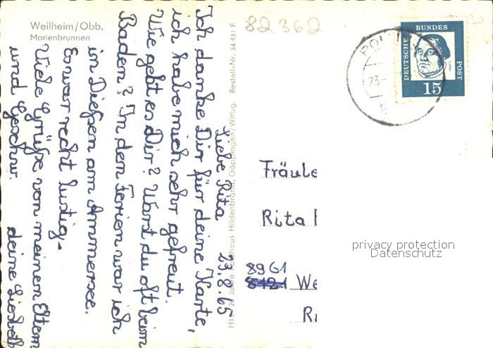 71930064 alte Postkarte Weilheim Oberbayern Marienbrunnen postalisch gelaufen Erhaltung siehe scans KatCode: 11110009190157