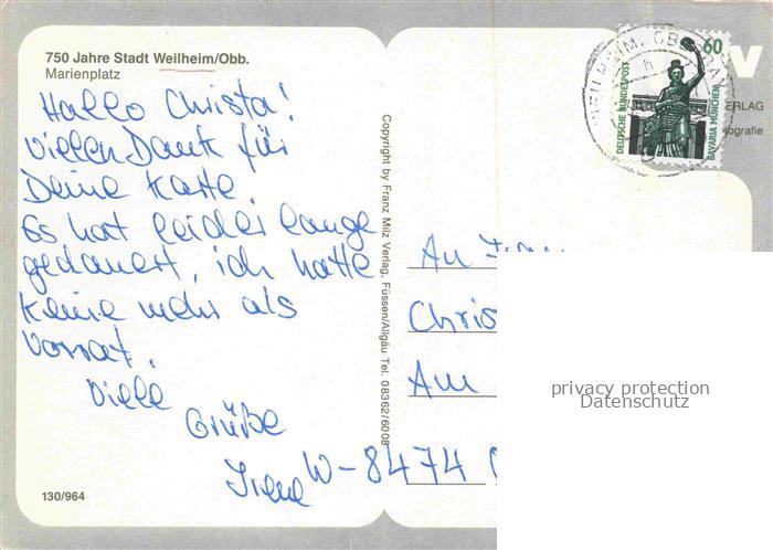 74020654 alte Postkarte Weilheim Oberbayern Marienplatz 750 Jahre Jubilaeum postalisch gelaufen Erhaltung siehe scans [FriedD77] KatCode: 11110009190157