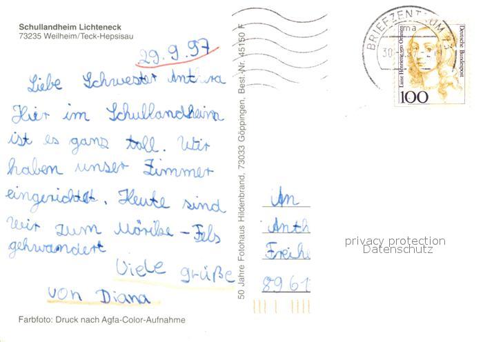 73005166 alte Postkarte Weilheim Teck Schullandheim Lichteneck postalisch gelaufen Erhaltung siehe scans [WerneD78] KatCode: 11110008116070