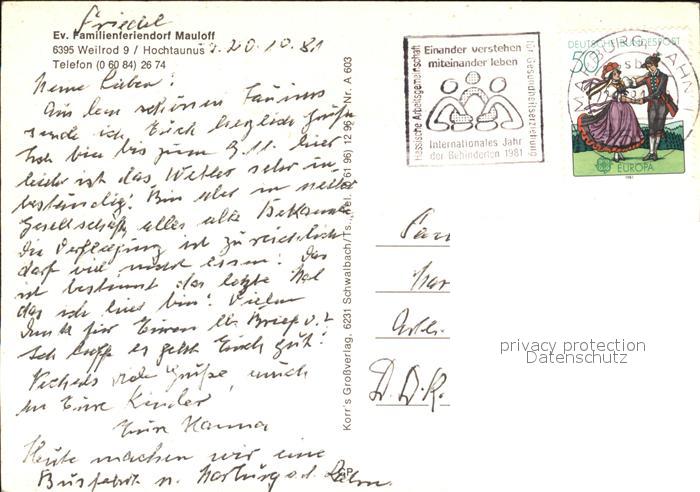 72497094 alte Postkarte Weilrod Evangelisches Familienferiendorf Mauloff postalisch gelaufen Erhaltung siehe scans KatCode: 11110006434013