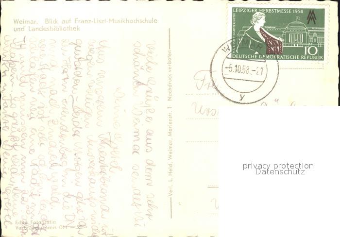 72473887 alte Postkarte Weimar Thueringen Franz Liszt Musikhochschule und Landesbibliothek postalisch gelaufen Erhaltung siehe scans KatCode: 11110016055000