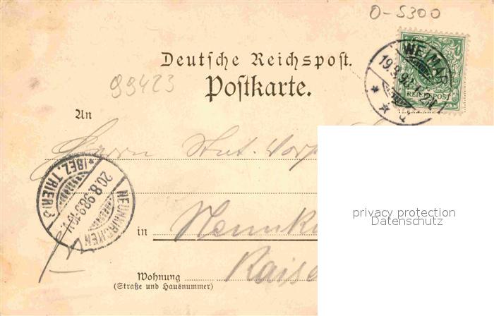 42730038 alte Postkarte Weimar Thueringen Goethe und Schiller Denkmal Schiller Wohnhaus Schloss Belvedere postalisch gelaufen Erhaltung siehe scans [NatalD47] KatCode: 11110016055000