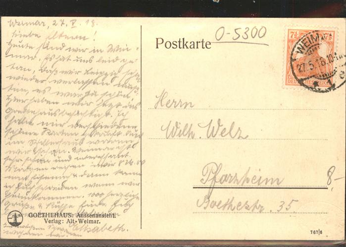 41421092 alte Postkarte Weimar Thueringen Goethehaus postalisch gelaufen Erhaltung siehe scans KatCode: 11110016055000