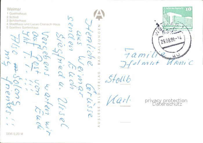 72321489 alte Postkarte Weimar Thueringen Goethehaus Gartenhaus Schloss Schillerhaus Lucas Cranach Haus postalisch gelaufen Erhaltung siehe scans KatCode: 11110016055000