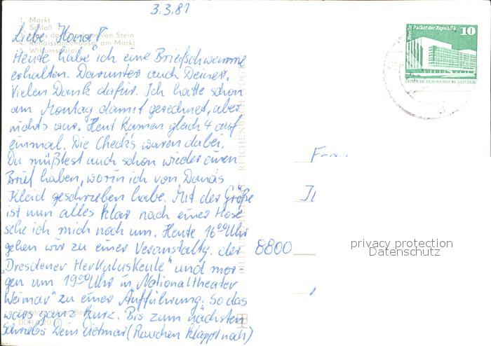 72337142 alte Postkarte Weimar Thueringen Markt Schloss Haus der Charlotte von Stein Renaissancehaeuser Markt Wittumspalais postalisch gelaufen Erhaltung siehe scans KatCode: 11110016055000