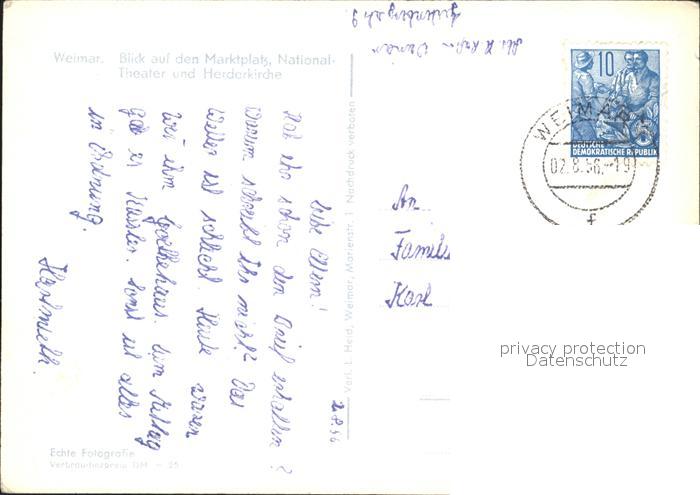 72314961 alte Postkarte Weimar Thueringen Marktplatz Nationaltheater Herderkirche postalisch gelaufen Erhaltung siehe scans KatCode: 11110016055000