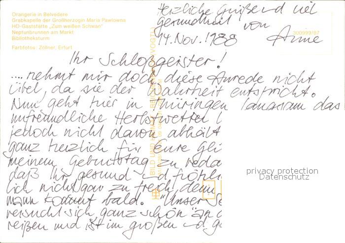 72352853 alte Postkarte Weimar Thueringen Orangerie Grabkapelle Maria Pawlowna HOG Zum weissen Schwan Neptunbrunnen Markt Bibliotheksturm postalisch gelaufen Erhaltung siehe scans KatCode: 11110016055000