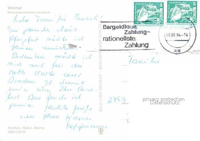72720851 alte Postkarte Weimar Thueringen Renaissancehaeuser am Markt postalisch gelaufen Erhaltung siehe scans [LiesaD40] KatCode: 11110016055000