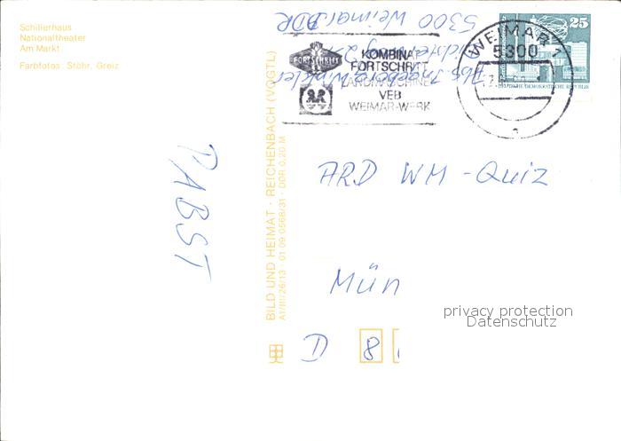 72322985 alte Postkarte Weimar Thueringen Schillerhaus Nationaltheater Markt postalisch gelaufen Erhaltung siehe scans KatCode: 11110016055000