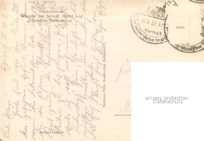 33624095 alte Postkarte Weimar Thueringen Schloss Markt Goethes Gartenhaus Fliegeraufnahme postalisch gelaufen Erhaltung siehe scans [PaolaD17] KatCode: 11110016055000