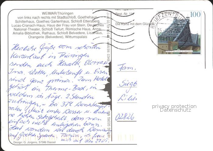 72337149 alte Postkarte Weimar Thueringen Sehenswuerdigkeiten Denkmaeler Schloesser Theater Pferdekutsche Goethe Schiller postalisch gelaufen Erhaltung siehe scans KatCode: 11110016055000