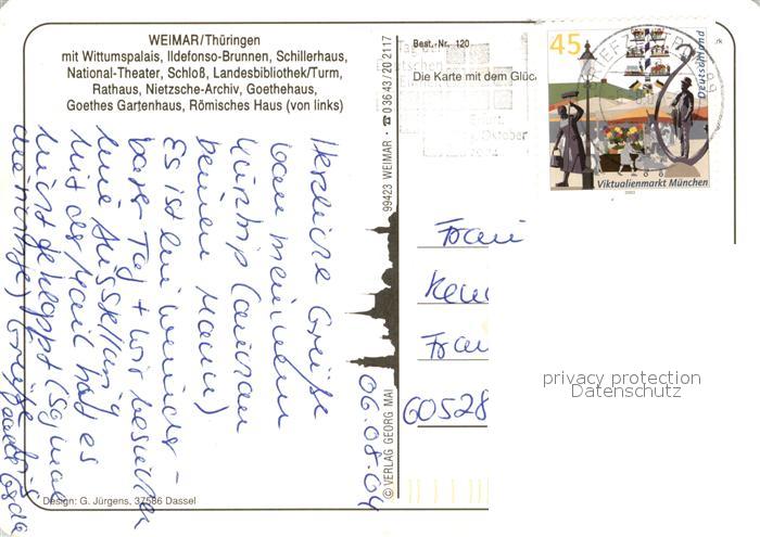 73126762 alte Postkarte Weimar Thueringen Wittumspalais Ildefonso Brunnen Schillerhaus Nationaltheater Rahaus postalisch gelaufen Erhaltung siehe scans [KathaD81] KatCode: 11110016055000