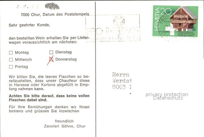 alte Postkarte Wein Bestellkarte Zanolari Soehne Chur postalisch gelaufen Erhaltung siehe scans