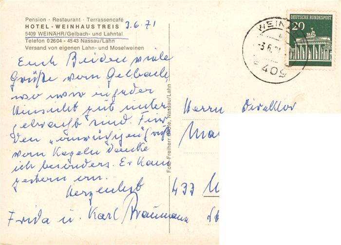 73878590 alte Postkarte Weinaehr Hotel Pension Weinhaus Treis postalisch gelaufen Erhaltung siehe scans [FriedD77] KatCode: 11110007141135