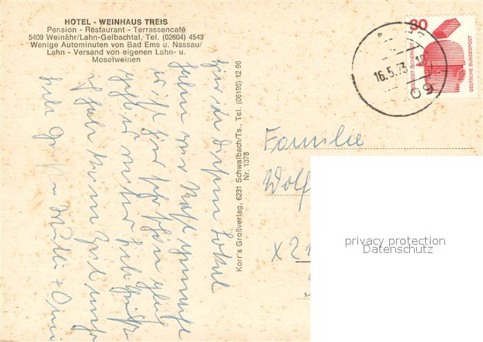 73664830 alte Postkarte Weinaehr Hotel Weinhaus Treis Gastraum Terrasse postalisch gelaufen Erhaltung siehe scans [WerneD78] KatCode: 11110007141135