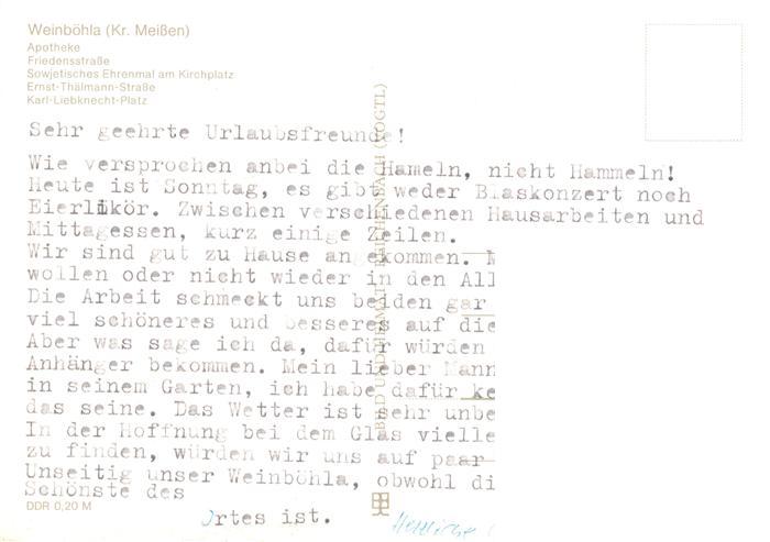 73908069 Weinboehla Apotheke Friedenstrasse Sowjet Ehrenmal Ernst Thaelmann Strasse Karl Liebknecht Platz postalisch nicht gelaufen Erhaltung siehe scans [WerneD78] KatCode: 11110014280440