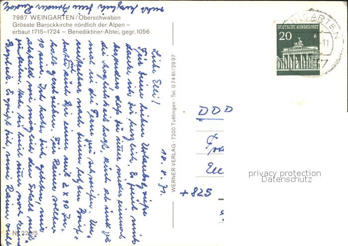 72420248 alte Postkarte Weingarten Oberfranken groesste Barockkirche Benedikter Abtei postalisch gelaufen Erhaltung siehe scans KatCode: 11110009478139