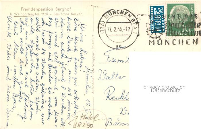 73803073 alte Postkarte Weingarten Wuerttemberg Fremdenpension Berghof postalisch gelaufen Erhaltung siehe scans [FriedD77] KatCode: 11110008436082